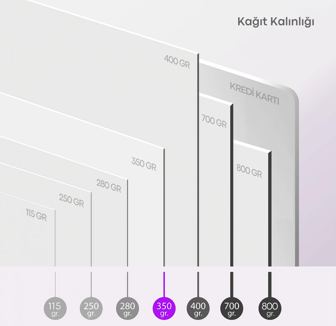 350 gr kartvizit dünyasında standart bir ağırlık haline gelmiştir. İkili ilişkilerde vermek istediğiniz bir kartvizit varsa bu ağırlık en tercih edilen ağırlıktır. Ancak, daha prestijli görünmek isteyen kişiler, 800 gr ağırlığına kadar olan kağıtları da tercih ediyorlar. Bu ağırlıktaki kağıtlar, kabartma desenler ve gümüş veya altın rengi yüzeylerle lüks bir izlenim yaratıyor.