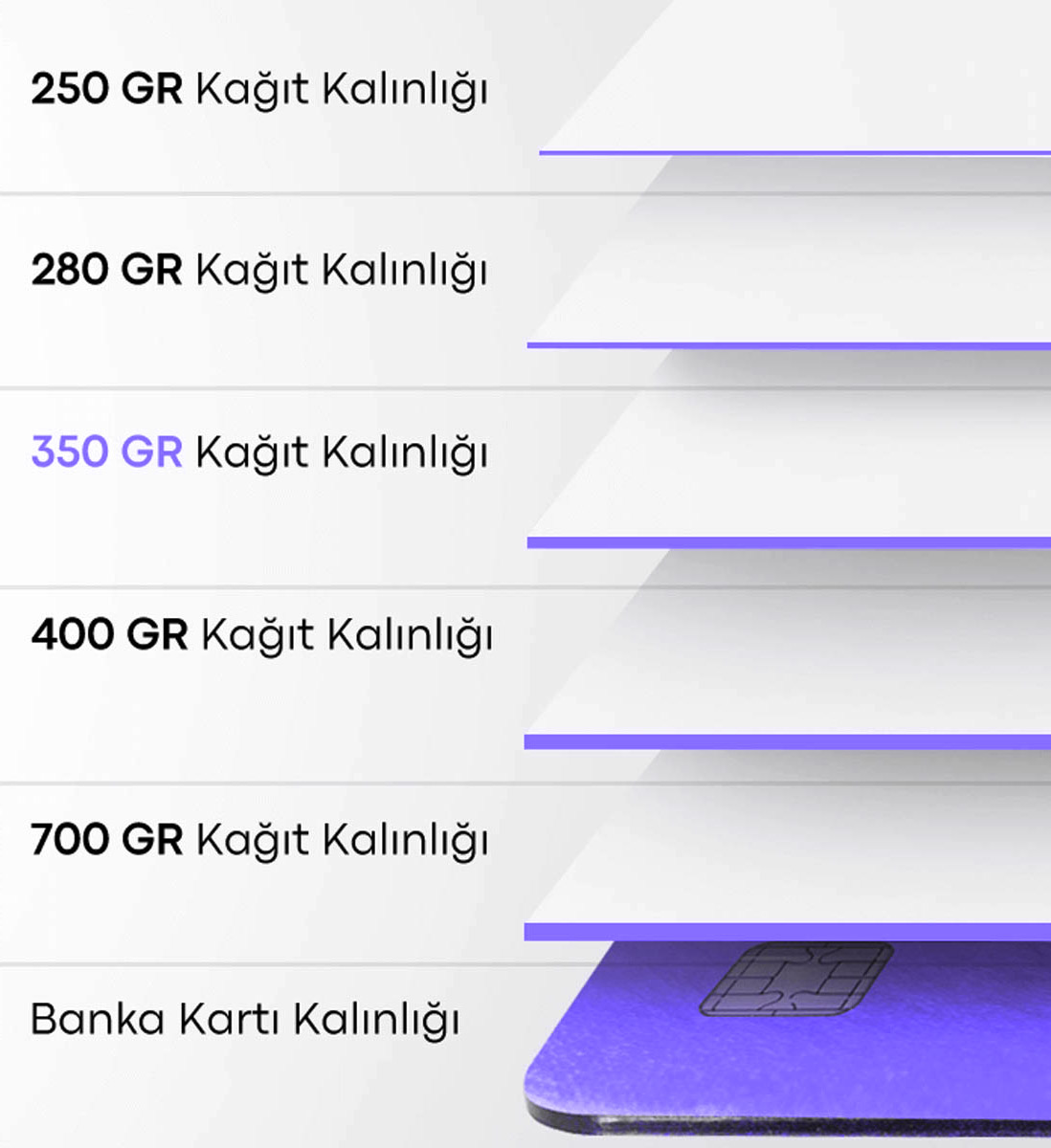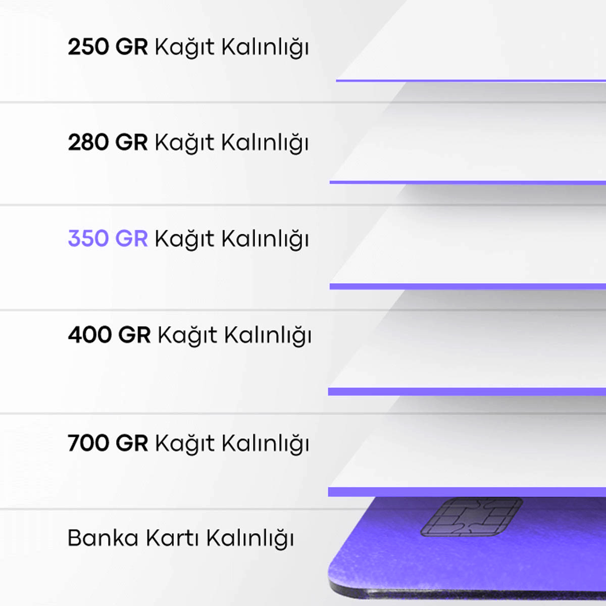 350 gr kartvizit dünyasında standart bir ağırlık haline gelmiştir. İkili ilişkilerde vermek istediğiniz bir kartvizit varsa bu ağırlık en tercih edilen ağırlıktır. Ancak, daha prestijli görünmek isteyen kişiler, 800 gr ağırlığına kadar olan kağıtları da tercih ediyorlar. Bu ağırlıktaki kağıtlar, kabartma desenler ve gümüş veya altın rengi yüzeylerle lüks bir izlenim yaratıyor.